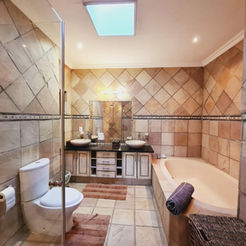 These bedrooms feature luxurious king-size beds including sleeper couches with generous cupboard space, cleverly concealing the TVs equipped with DSTV. These air-conditioned rooms each have access to their own opulent en-suite bathrooms, complete with double vanities, a shower, and a spacious bath.